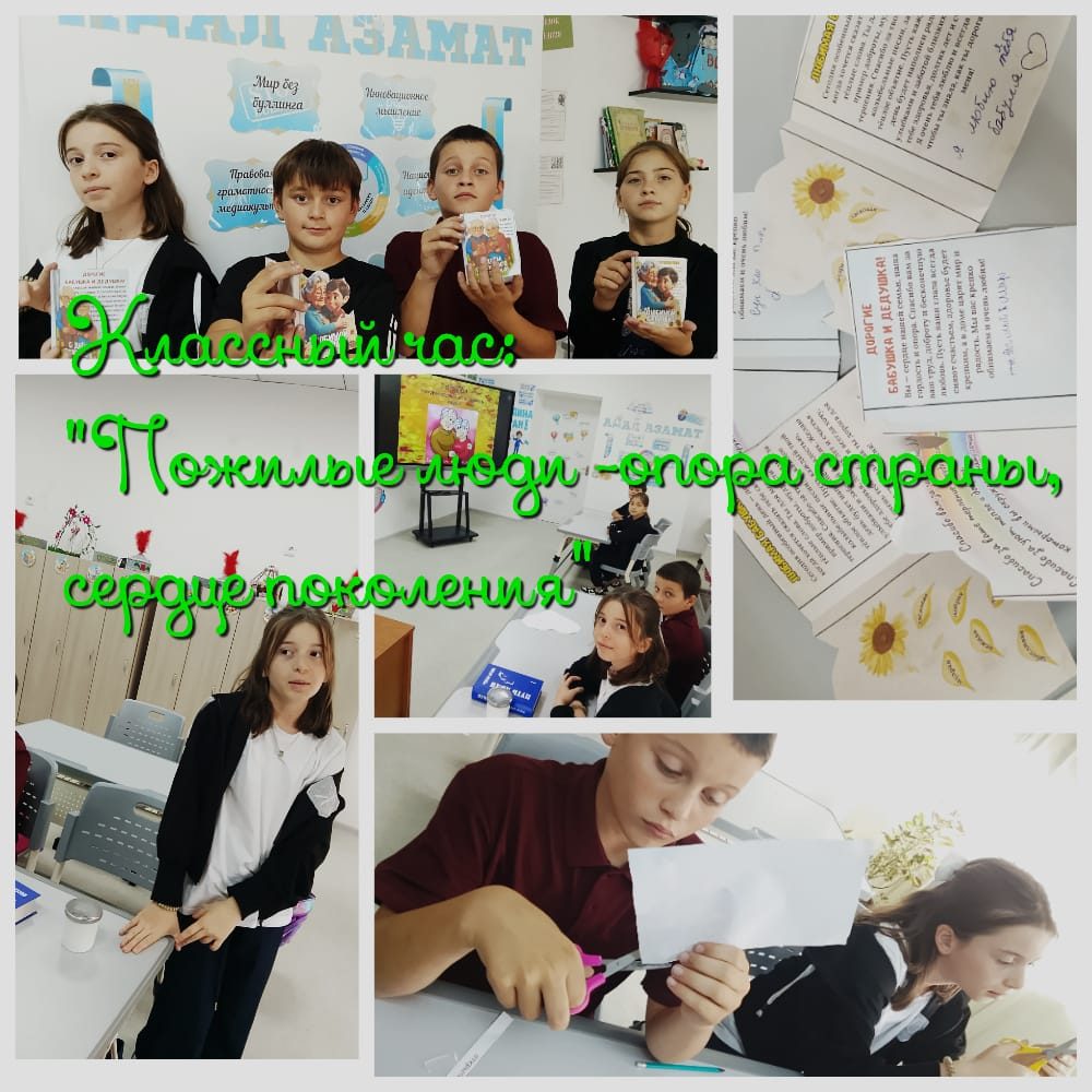1 қазан қарсаңында 4-сыныпта"қарт адамдар — елдің тірегі, ұрпақтың жүрегі"тақырыбында сынып сағаты өтті. Жігіттер ата-әжелері туралы жылы лебіздерін білдірді, сондай-ақ оларға құрмет пен сүйіспеншіліктің белгісі ретінде әдемі ашық хаттар жасады.