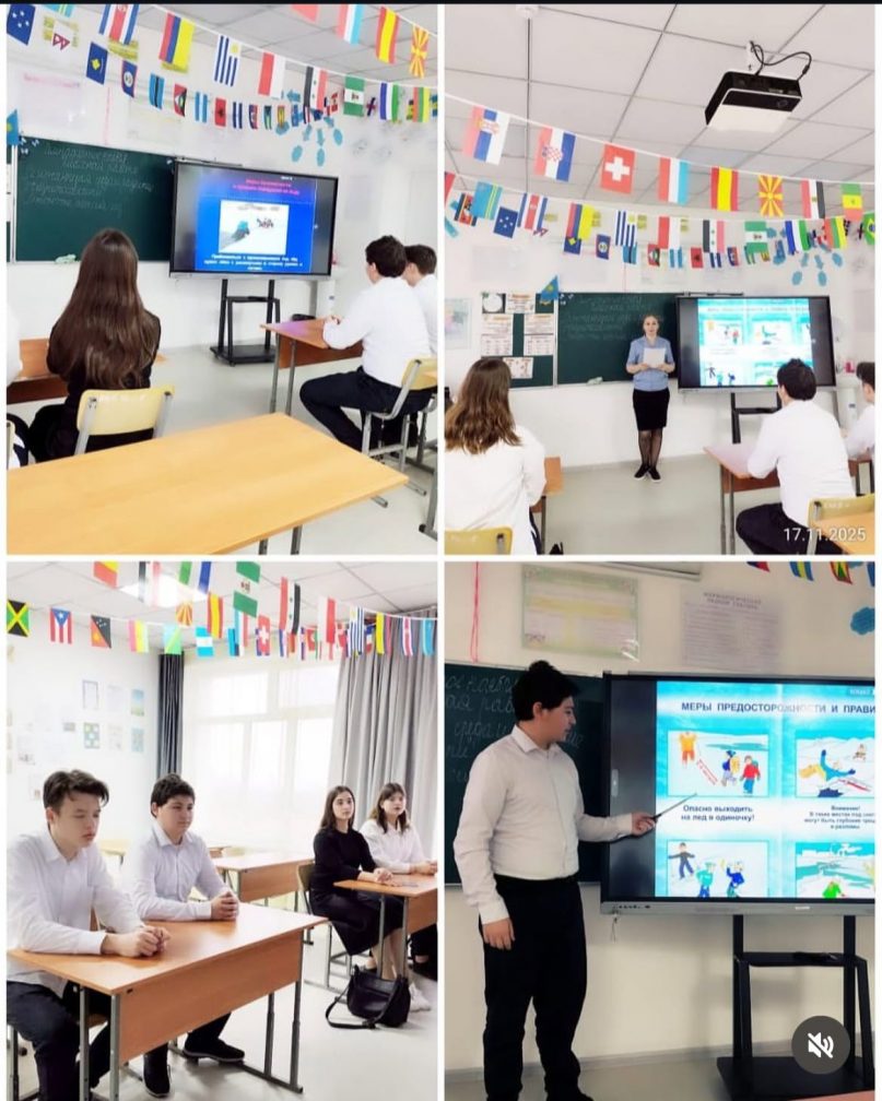 Сабақ барысында балалар мұздың қандай температурада қауіпсіз болатынын, оның беріктігін қандай белгілер көрсететінін және неге ересектерсіз мұздатылған өзендер мен көлдерге шыға алмайтындығын білді. Мұғалім егер адам мұз астына түсіп кетсе, қалай дұрыс әрекет ету керектігін және зардап шеккен адамға өміріне қауіп төндірмей қалай көмектесуге болатынын түсіндірді.